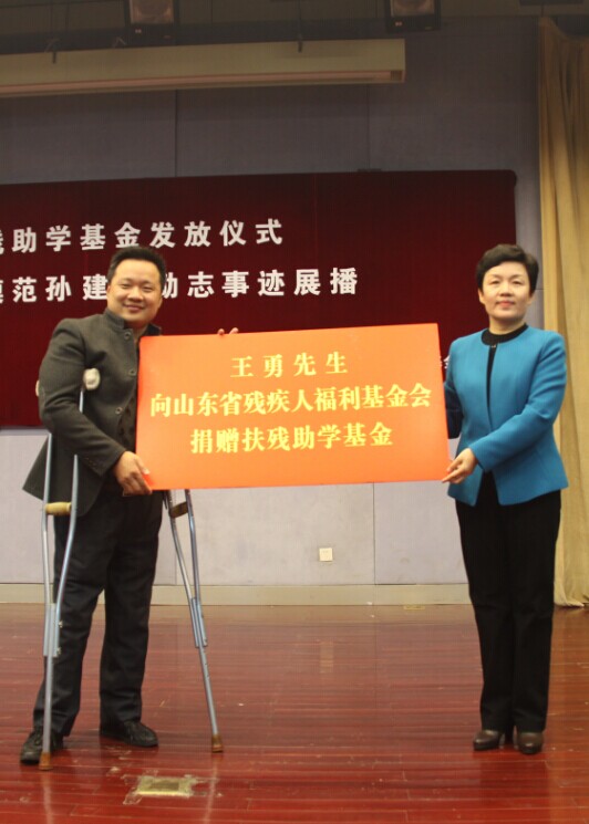12月2日,為慶祝“國(guó)際殘疾人日”,山東麥德森文化傳媒有限公司、山東中醫(yī)藥大學(xué)、山東省肢協(xié)、山東省殘疾人福利基金會(huì)在長(zhǎng)清大學(xué)城舉行“攜手殘疾大學(xué)生,共圓燦爛中國(guó)夢(mèng)”---王勇扶殘助學(xué)基金發(fā)放儀式暨全國(guó)自強(qiáng)模范孫建博勵(lì)志事跡展播活動(dòng)。公司董事長(zhǎng)王勇、山東中醫(yī)藥大學(xué)副校長(zhǎng)田立新、山東省殘聯(lián)主席團(tuán)秘書處辦公室主任李新蘭、山東省殘疾人福利基金會(huì)辦公室主任王雪磊、全體學(xué)團(tuán)干...