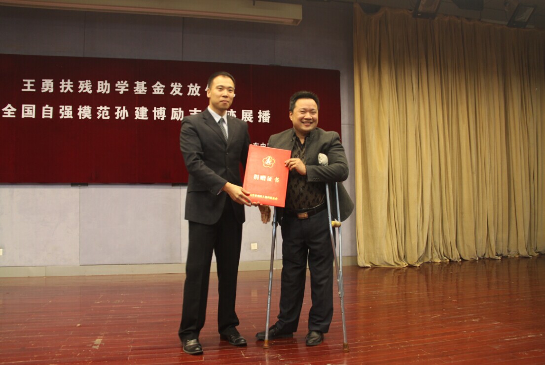 助學(xué)基金發(fā)放儀式上,山東省殘疾人福利基金會(huì)向王勇頒發(fā)了捐贈(zèng)證書和愛心助殘大使獎(jiǎng)杯。全國自強(qiáng)模范、省肢協(xié)主席孫建博還派出代表吳衛(wèi)東與王勇一起向全校殘疾大學(xué)生捐贈(zèng)100套勵(lì)志書籍。助學(xué)基金發(fā)放儀式后,全體師生觀看了以孫建博為原型的勵(lì)志電影《完美人生》。