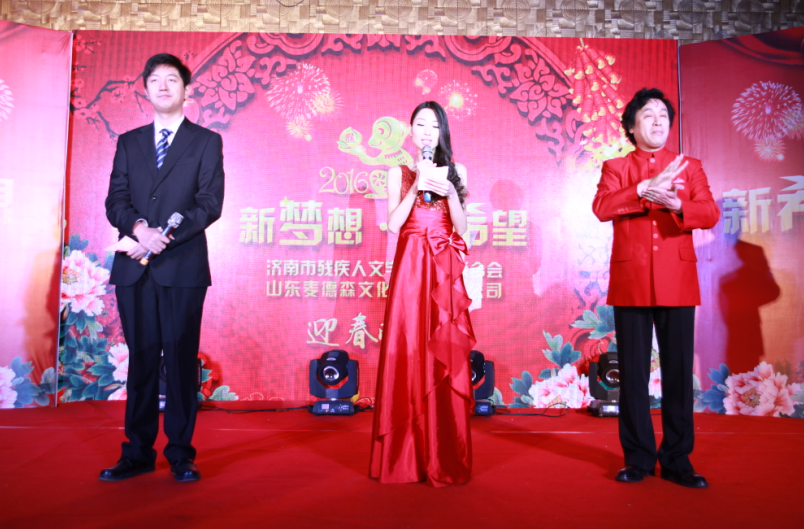 2016年1月24日,濟南市殘疾人文學藝術界聯合會(以下簡稱市殘疾人文聯)、山東麥德森文化傳媒有限公司主辦的“新夢想·新希望”迎春晚會在魚翅皇宮大酒店圓滿落下帷幕。出席本次晚會的有山東省新聞出版廣電局、山東廣播電視臺、山東省殘聯、山東省殘疾人福利基金會、濟南市殘聯、濟南市歷下區殘聯、山東中醫藥大學等單位的領導和老師,以及山東麥德森文化傳媒有限公司請到的來自全國各地的合作伙伴,與會人員350余人。晚會殘健交融,歡聲笑語,共同度過了一個難忘而歡樂的夜晚。