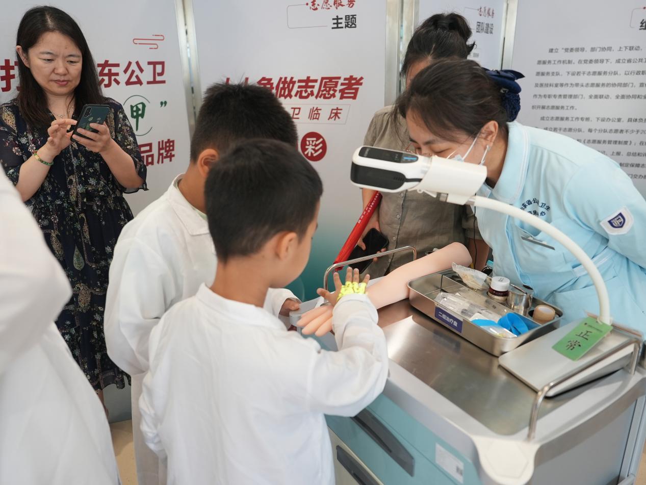 在了解了生命的誕生后,工作人員教給孩子們打針如何找血管。工作人員先給孩子們講解了人體血管的基本分布和特點,然后通過現場模擬演示,讓孩子們直觀地看到如何在手臂上準確找到血管。孩子們個個躍躍欲試,在工作人員的耐心指導下,小心翼翼地用模擬道具進行操作。這個環節不僅讓孩子們掌握了實用的生活技能,還培養了他們的觀察力和動手能力。
