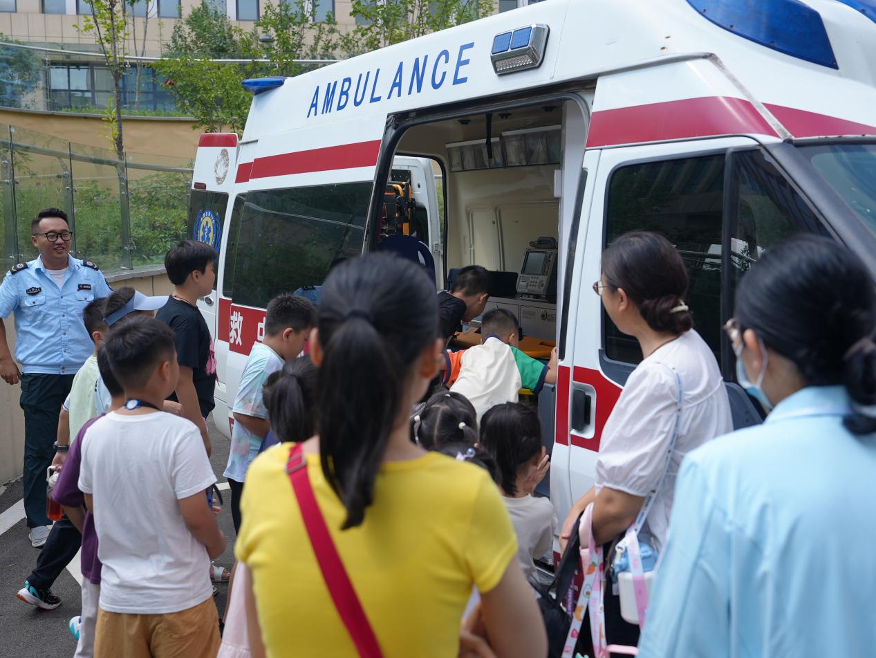 活動的最后一個環節是參觀救護車。孩子們懷著好奇和興奮的心情,排著整齊的隊伍來到救護車旁。工作人員打開車門,向孩子們介紹了救護車內的各種設備和功能,如擔架、除顫儀、氧氣瓶等。孩子們一邊聽工作人員講解,一邊仔細觀察。當得知這些設備在搶救病人時能夠發揮巨大作用時,孩子們紛紛露出了敬佩的神情。