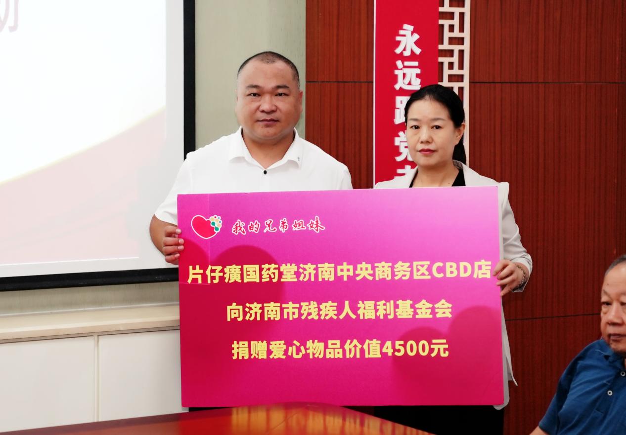 片仔癀國藥堂濟南中央商務區(qū)CBD店向濟南市殘疾人福利基金會捐贈愛心物品,市殘疾人福利基金會理事長程強為其頒發(fā)榮譽牌匾,并現場向受助代表發(fā)放愛心物品。