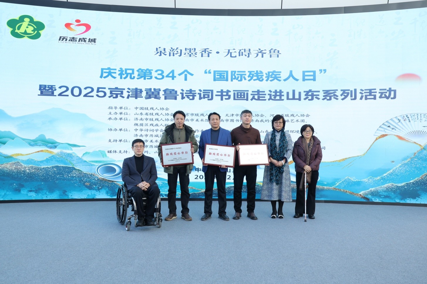 活動現場,為“藝盟苑”公益繪畫培訓項目優秀學員頒發結業證書,并向濟南市美術館、圖書館,歷城區美協等愛心單位授牌,彰顯社會力量對殘疾人事業的支持。