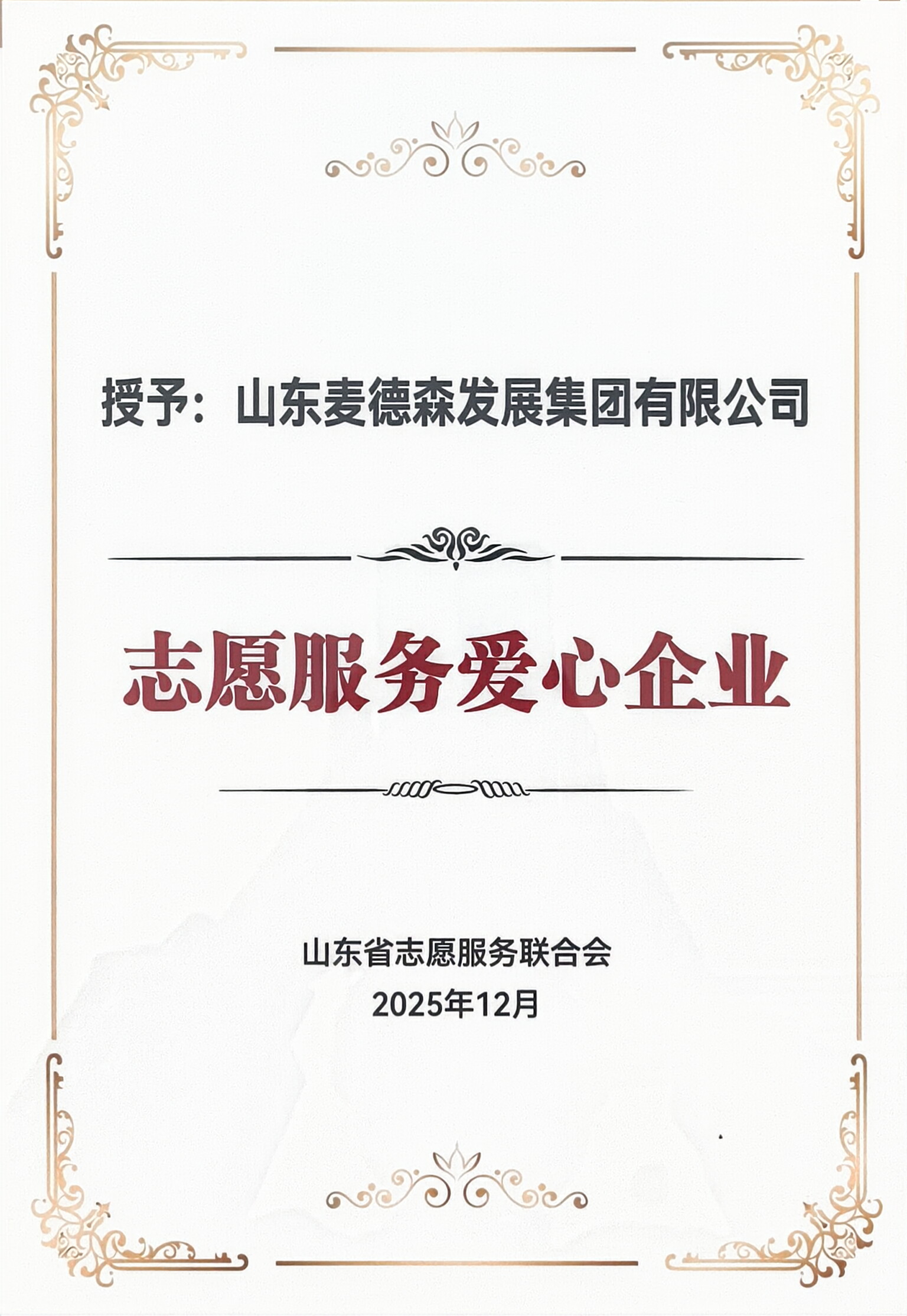 麥德森獲頒山東省志愿服務聯(lián)合會“志愿服務愛心企業(yè)”殊榮