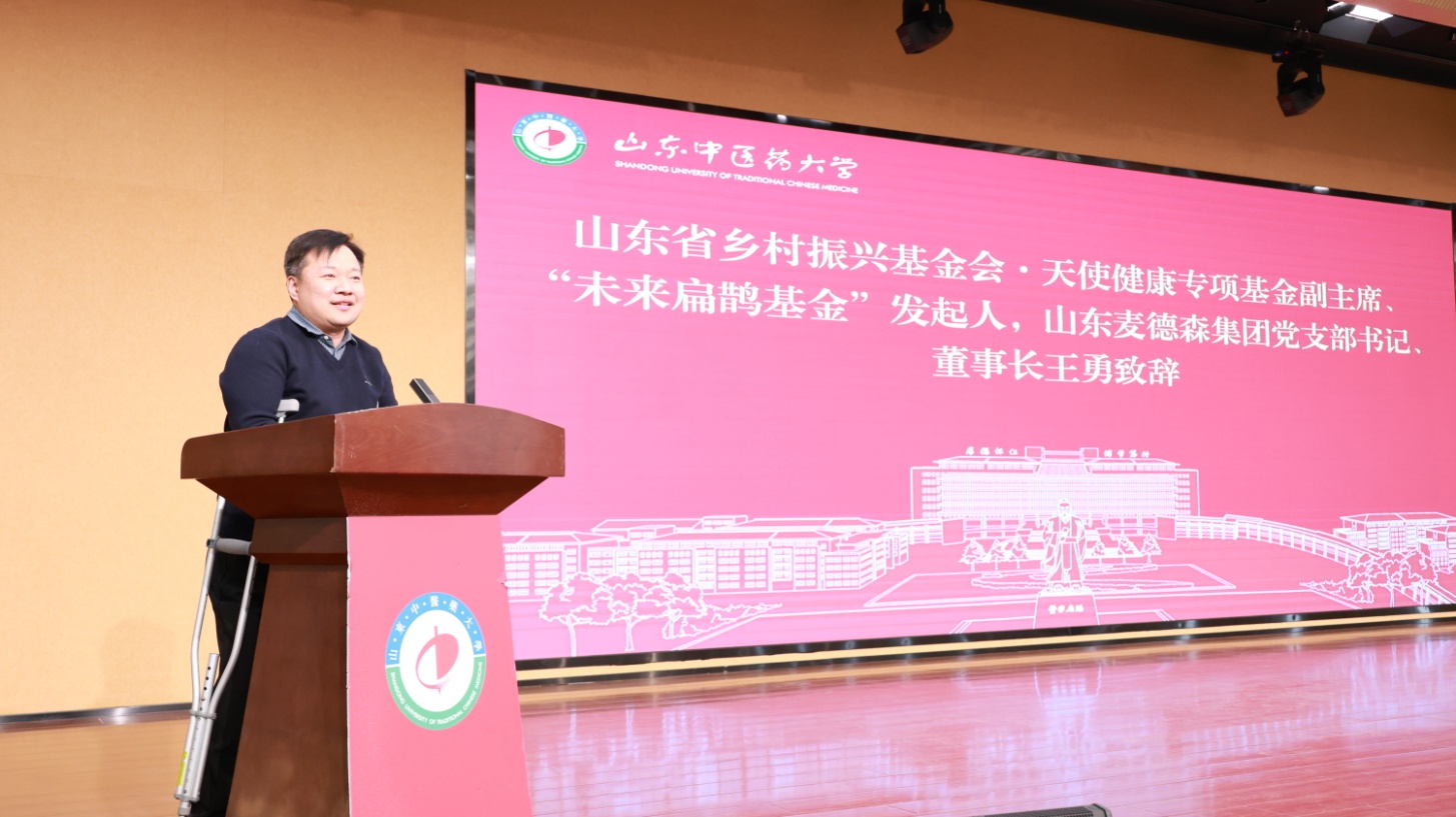 為共同推動中醫藥事業傳承創新,2023年12月,在山東中醫藥大學舉辦的“天使健康救助”十年公益盛典上,山東省鄉村振興基金會、山東中醫藥大學與山東麥德森發展集團三方攜手,共同揭牌成立了“未來扁鵲基金”。項目的創立旨在鼓勵研究生科研創新,提高學術水平及教育培養質量,全方位探索中醫藥人才培養新思路。