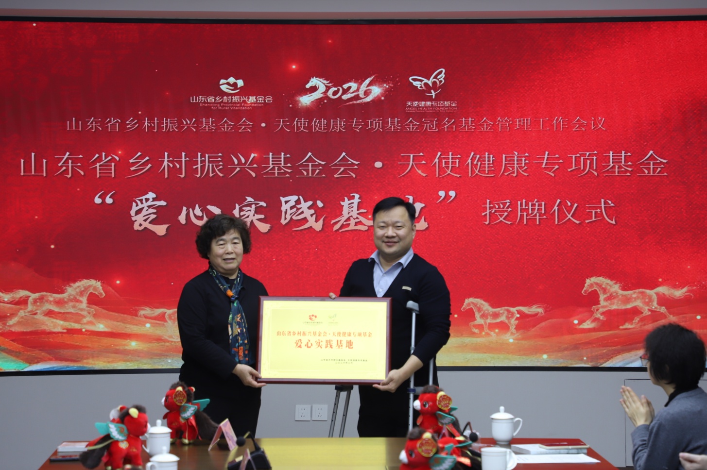 會上,劉玉芹向山東麥德森發(fā)展集團授予“天使健康專項基金·愛心實踐基地”牌匾。