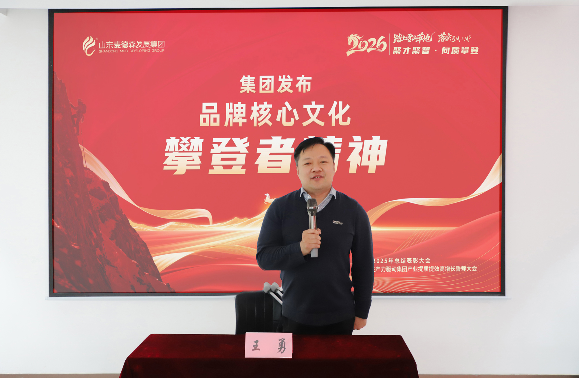 2月13日,在以“踏上雪山草地、落實3M+M3,聚才聚智、向質攀登”為主題的2026新質生產力驅動集團產業提質提效高增長誓師大會上,集團黨委書記、董事長王勇正式發布麥德森集團品牌核心文化——“攀登者精神”。這是麥德森發展史上首次以清晰定義、系統闡釋的方式,確立集團共同的精神坐標。