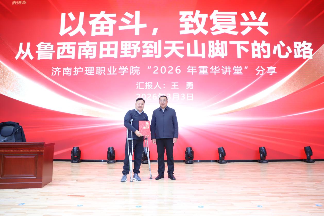 3月3日上午,受濟(jì)南護(hù)理職業(yè)學(xué)院特別邀請,山東麥德森發(fā)展集團(tuán)黨委書記、董事長王勇走進(jìn)校園,為新疆班全體師生帶來了一場催人奮進(jìn)的“2026年重華講堂”專題演講,并帶領(lǐng)集團(tuán)一行5人開展新疆班師生慰問活動。濟(jì)南護(hù)理職業(yè)學(xué)院黨委書記周敬出席活動發(fā)表講話、并全程陪同參觀。