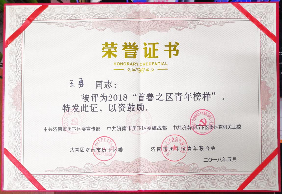 為更好地學習貫徹黨的十九大精神和習近平新時代中國特色社會主義理論,深入推進“勇做奪標突擊手,爭當濟南第一團”活動, 5月4日上午,紀念“五四”主題活動暨“2018首善之區青年榜樣”頒獎典禮在歷下大廈隆重舉行。歷下區委副書記尹紅梅,區委常委、組織部部長續明,區委常委、統戰部部長杜寶現,副區長丁曉紅,區政協副主席房玉萍等領導出席本次活動。我集團董事長王勇在本次活動中榮獲2018“首善之區青年榜樣”榮譽稱號。