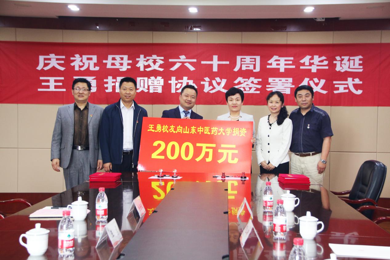 5月22日,我集團董事長、山東中醫藥大學校友王勇回歸母校,參加了“慶祝母校六十周年華誕,王勇捐贈協議簽署儀式”。山東中醫藥大學黨委委員、副校長田立新,研究生處書記唐迎雪,圖書館館長馬傳江,學生工作處處長念金波,研究生處副書記楊廣杰出席此次儀式。