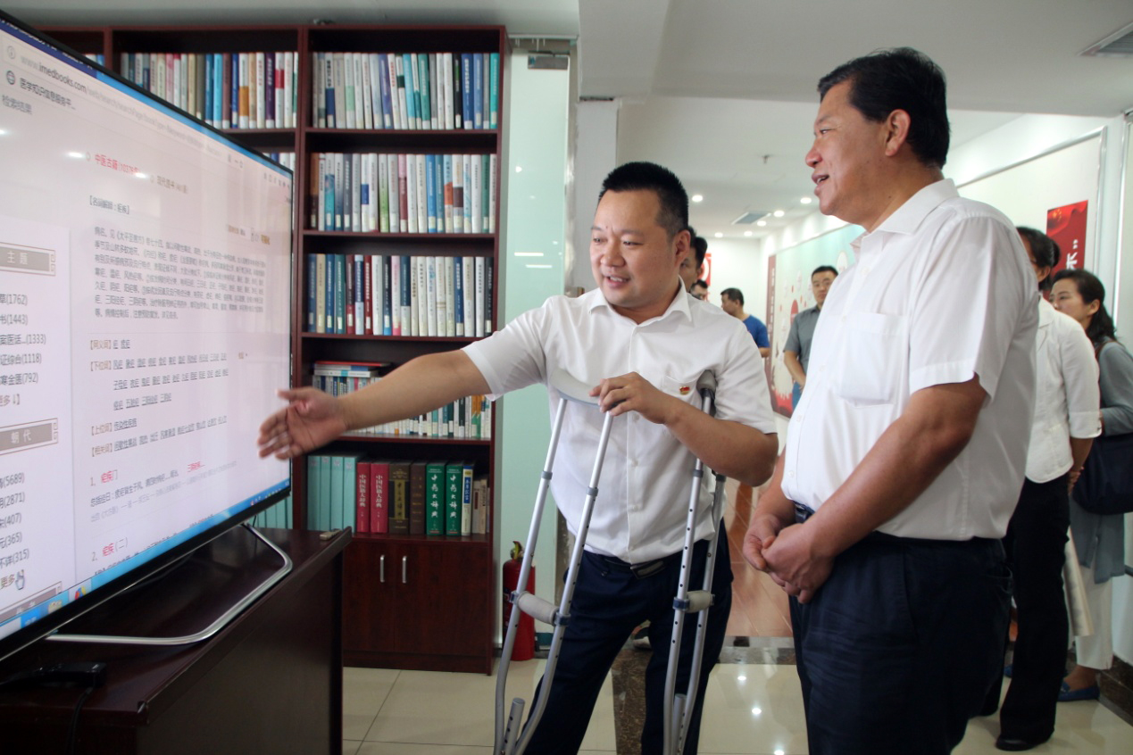 在王勇博士的陪同下,山東省委政法委辦公室黨支部全體黨員對集團整體業務發展、集團黨建工作、醫學知識信息服務平臺——“博覽醫書”項目以及殘疾人事業發展等內容進行了深入了解。王勇博士對醫學知識信息服務平臺——“博覽醫書”項目親自進行演示和講解,匯報了自己開發“博覽醫書”項目的初衷,以及對于中醫藥事業發展的遠大目標理想,得到了林峰海書記的高度認可和贊賞。