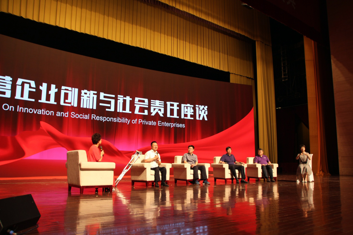 論壇啟動儀式后,在主持人毛馨的帶領下,我集團黨支部書記王勇博士與山東省宏觀經濟研究院戰略規劃所所長、山東省智庫高端人才劉德軍,清華大學天津高端裝備研究院洛陽先進制造產業研發基地黨支部書記兼執行主任馬明星,山東大學殘疾人事業發展研究中心主任、哲學與社會發展學院社會工作系教授、博士生導師葛忠明一道,暢談民營企業創新與社會責任。